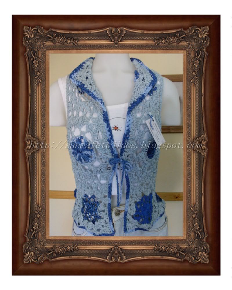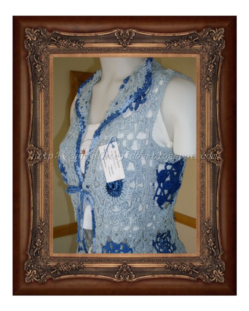 Realizada en tricot, con hilo de algodón azul. Importantes detalles florales en escote, acentuados con mostacillas.